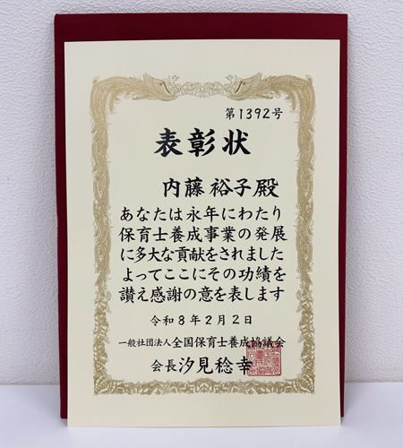この表彰は、一般社団法人全国保育士養成協議会の会員校に勤務し、保育士の養成に多大な貢献をなした教職員を表彰し、その業績をたたえるものです。