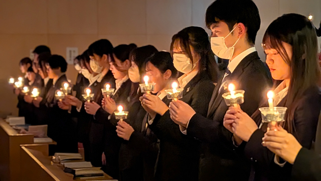 厳かな雰囲気の中、学生たちは神父様からお言葉をいただき、今年1年の自分自身を振り返った後、ろうそくに明かりを灯して、主イエスキリストの降誕をお祝いしました。