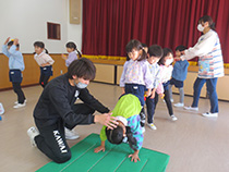 年長組・年中組は月1回程度、保育時間の中でカワイ体育教室の講師による体育教室を行っております。 マット運動や跳び箱をはじめ、鬼ごっこなど体を動かす運動をみんなで楽しみます。 また、午後からは本園遊戯室にて、課外カワイ体育教室もあります。 |