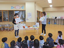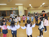 年長組では、月1回程度、保育時間の中で聖園短大の先生による英語教室を行っております。みんなで英語の歌を歌って踊ったり、絵本を見ながら身近な英語に触れたりして、楽しみながら英語を学んでいます。
