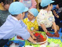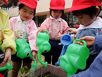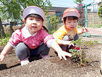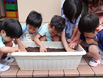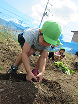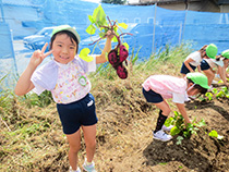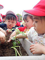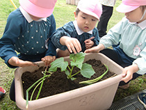 2~5歳児の食育活動として野菜の栽培や食材に触れることで、興味や関心をもち、五感を通して体験しています。(じゃがいも、枝豆、大根、とうもろこし、さつまいも、とまと、きゅうりなど) |