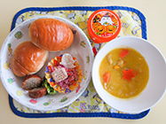 幼稚園で作っている温かい、おいしい給食をいただきます。毎日の給食は、子どもたちの味覚にあった薄味の調味で、又いろいろな野菜が入ったバラエティに富んだメニューを提供しています。子どもたちにも大好評です。 ![]() ≪ハロウィン給食≫