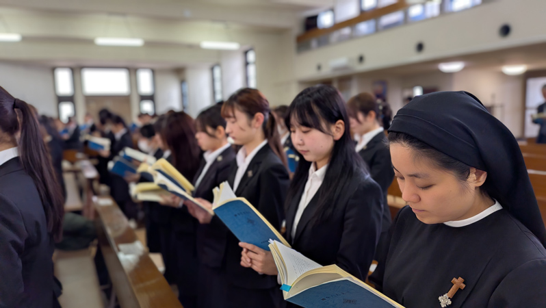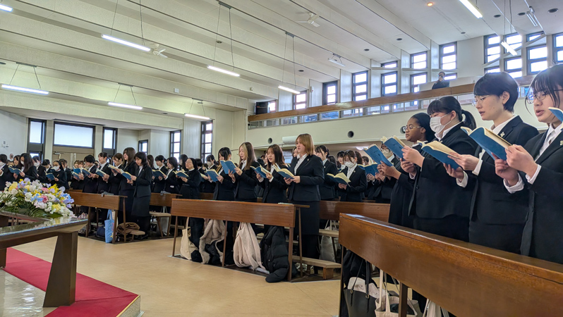レポート:卒業感謝のミサ 令和8年3月5日(木)に、カトリック秋田教会において、飯野耕太郎神父の司式のもと『卒業感謝のミサ』を執り行いました。本学での学びを終え4月から社会人として新たな一歩を踏み出す2年生を1年生・教職員が祝福し、参加者全員で祈りと感謝を捧げました。