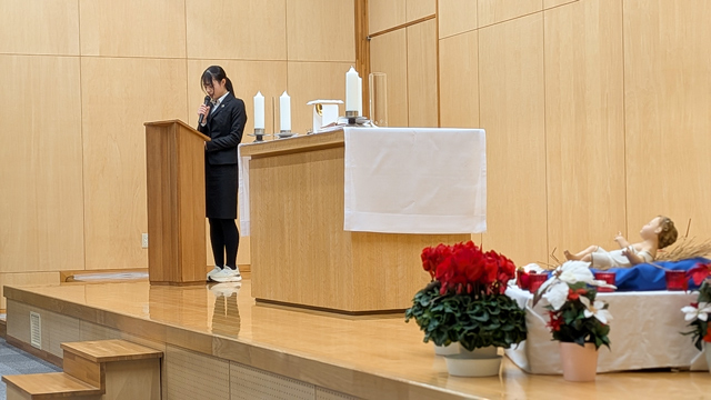 厳かな雰囲気の中、学生たちは神父様からお言葉をいただき、今年1年の自分自身を振り返った後、ろうそくに明かりを灯して、主イエスキリストの降誕をお祝いしました。